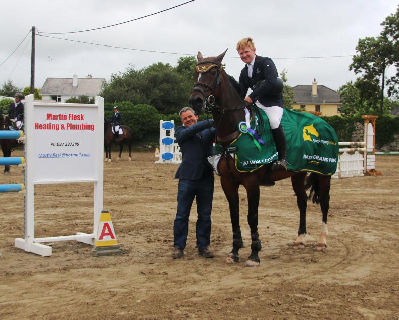 Connaught rider, Shane Goggins proved to be a popular winner of the National Grand Prix in Galway County Show last Sunday. Riding Wrangler II, he was one of six double clears in a ten way jump-off. Fifth to go over the Paul Duffy designed course, Goggins lodged the winning round of 39.41 seconds, to claim the lion’s share of €5,000 on offer, in the jointly sponsored Martin Flesh and Walsh Heating & Plumbing sponsored class.