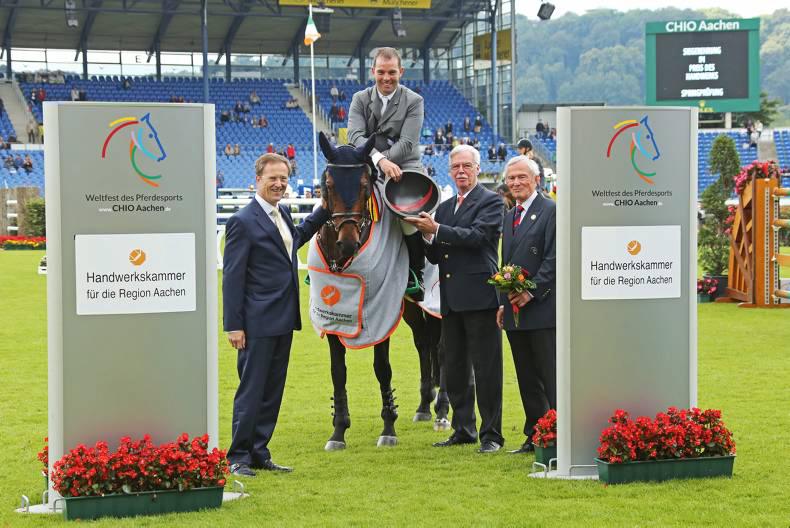 Cian O'Connor and Be Gentle, a KWPN mare, enjoyed two wins at five-star Aachen. They are pictured here with Peter Deckers, CEO Handwerkskammer Aachen, Dieter Philipp, president of HWK and president of the Aachen-Laurensberger Rennverein e.V. Carl Meulenbergh