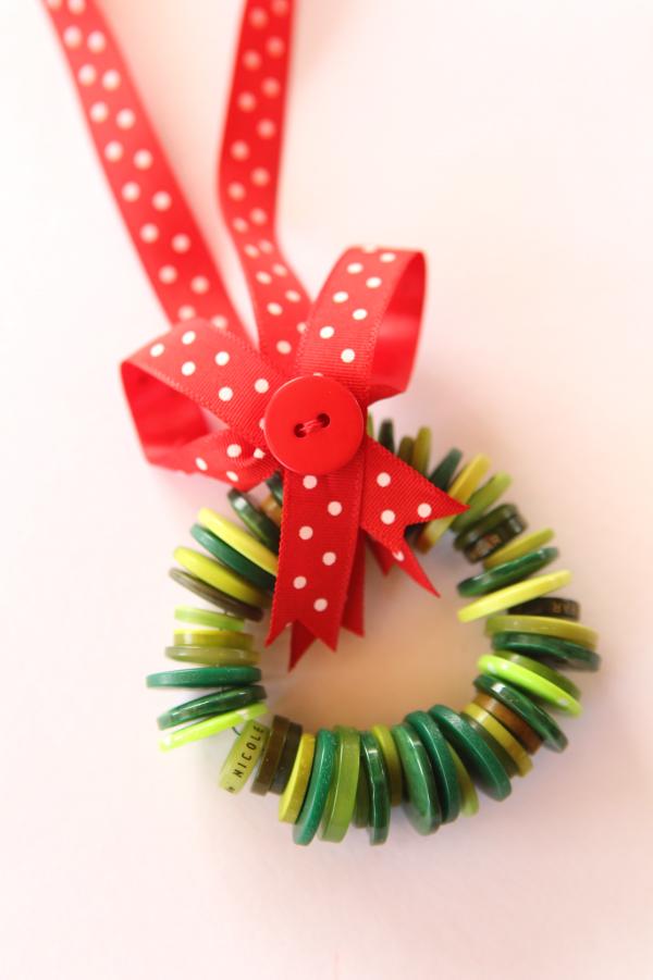 4 To finish the button wreath, simply use a leftover ribbon to create a decorative bow and loop for hanging the ornament on the Christmas tree.