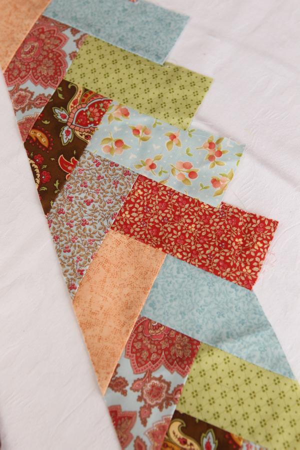 1Following diagram A, lay fabric strips together to form centre piece of runner (picture one). Sew strips together taking ¼” seams, clipping threads as you go and pressing all seams in an upward direction.