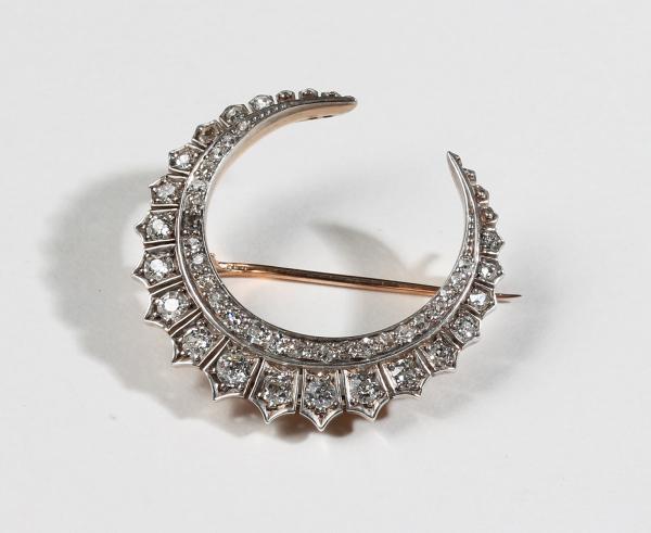 2: An antique diamond-set crescent brooch mounted in gold.