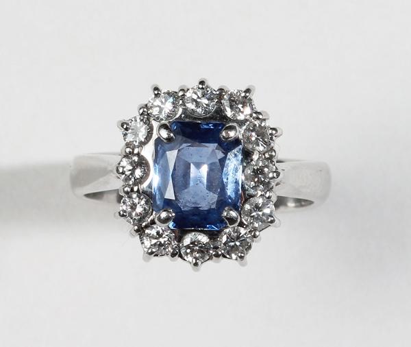 1: A diamond and sapphire cluster ring mounted in 18ct white gold.