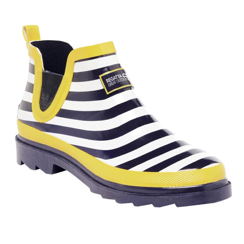 10 Harper, low wellington boots with a navy and lemon stripe, Regatta (€28)