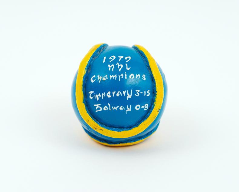 The hurling sliotar (pictured) belongs to Paddy Williams of Kilruane MacDonaghs. The sliotar was used in the National Hurling League Final won by Tipperary on 6 May 1979. The ball was painted by John McCarthy from Coolnamon.