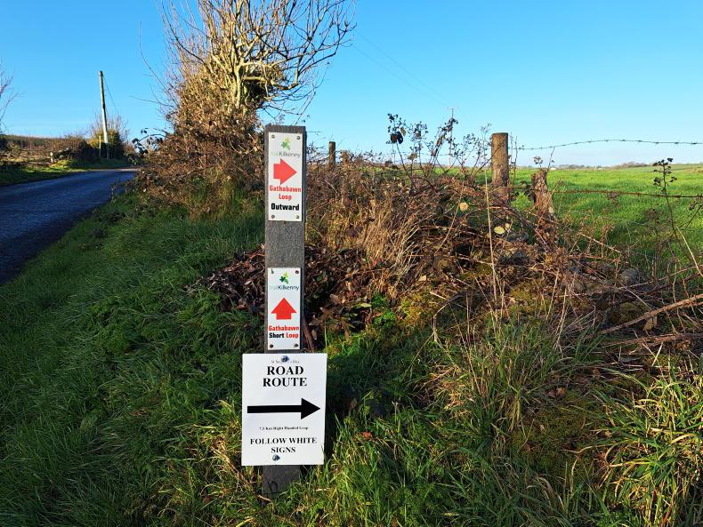 Signs indicating the long and short route along the way for the annual St Stephen's Day charity walk taking place in Gathabawn, Co Kilkenny.