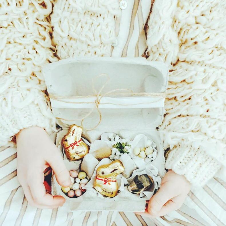 Take off any external stickers and tie some ribbon, mesh or twine around the lid. You can also add pom poms or bows if you have them. Put a little tissue paper into each hole and fill with Easter delights - chocolate bunnies, eggs, small flowers, little wooden eggs, anything at all that signals Easter to you. Tie with a bow and voila!