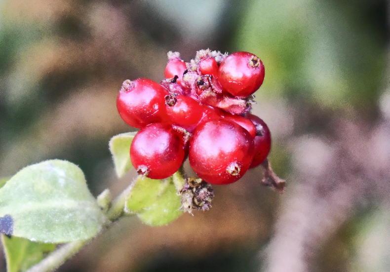 Look out for clusters of bright scarlet red berries of honeysuckle, found on top of twisted stems hanging from trees or shrubs. These are usually above the body of the hedge, where the plant has scrambled up to the light to flower earlier in the year.
