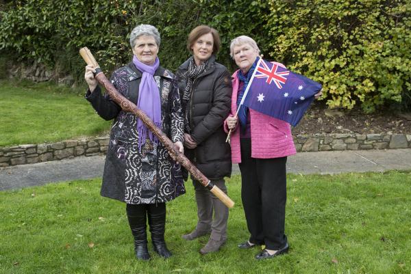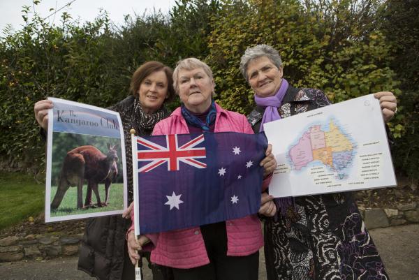 The Kangaroo Club has given these women the opportunity to celebrate and learn about their families’ lifestyles in Australia. Mary Healy proudly dons a scarf hand-painted by Aborigines, and Mary Coleman shows off an impressive didgeridoo brought home by her daughter Susan on her return from Oz.