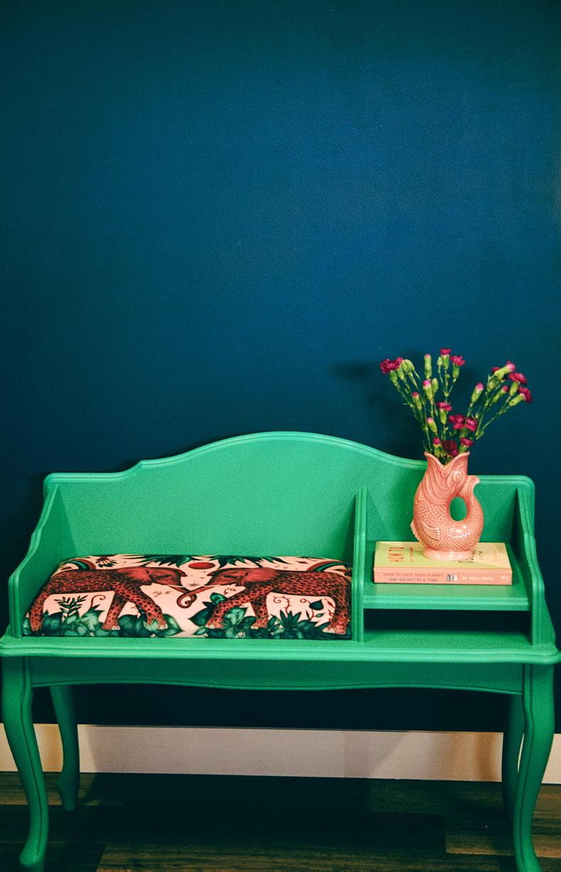 Green telephone seat upcycled by ReFunk's Erika Deeter @up_it_e.