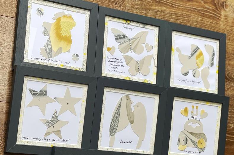The patterns for each frame come from carefully hand-traced and cut designs using re-used and upcycled paper, card materials, for example wallpaper sheets and cards.