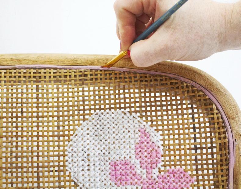 The cane backing on this chair made the perfect blank canvas for a giant cross stitch design. This technique is a great way to add colour and personality to a vintage piece without any commitment to a permanent change, as the stitches can be easily removed. A little extra care is needed to make sure that the back is as neat as the front – remember that both sides will be visible.