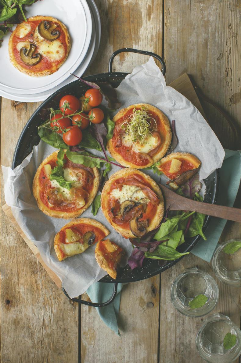 9 Spoon on your sauce, spread it out then grab a good handful of cheese and sprinkle over each pizza. Pop the bases back in the oven for five to 10 minutes to let the cheese melt. After this, take them out, arrange your mushrooms, pineapple and ham and pop back in for another 10-15 minutes until the cheese is golden brown.