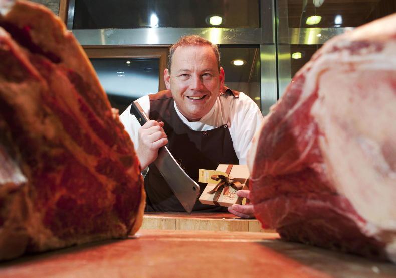 Pat Whelan, who runs James Whelan Butchers picture with Joe O’Mahony, supervising craft butcher at the shop in Dunnes Stores, Swan Centre, Rathmines, Dublin. \ Dara Mac Dónaill