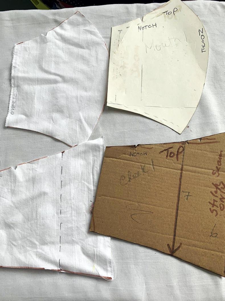 2 Prepare the nose and cheek pieces by sewing a ¼ inch seam on the edge seams as this will be the finished edge when the mask is turned out.