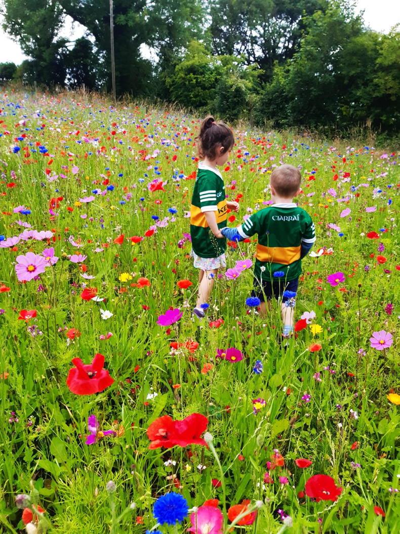 Wildflowers on a beef farm in the Kingdom: Orlaith and Darragh Coakley with their cousin Elizabeth Fitzmaurice in their daddy's (Donnacha Coakley's) wildflower meadow to help promote the bee population and biodiversity in Rathmore, Co Kerry.