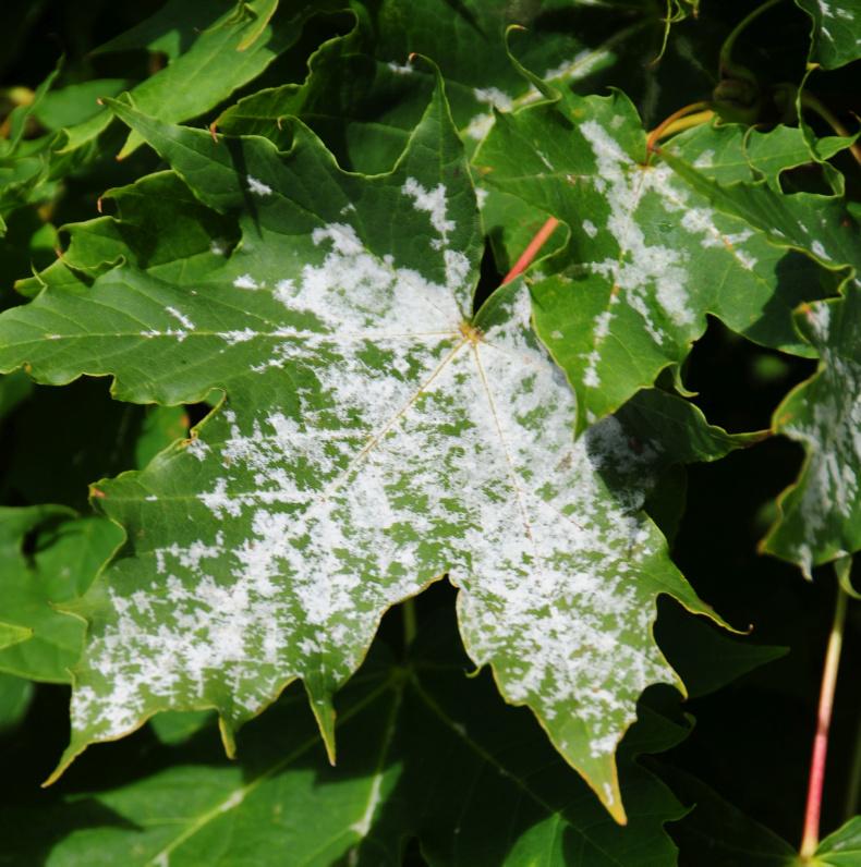 It is very common for young trees to be practically covered with white, powdery mildew at this stage of the growing season, notably oak and maple. The upper and lower leaf surface can be covered with white mycelium, a layer of microscopic fungal tubes. These tap into the cells of the plant’s leaves and draw out sap as a source of food and water to produce more infective spores. While the fungus does draw some sap from the plant, it does very little harm and young trees are not significantly affected. The coating of white fungus does not greatly affect the green chlorophyll underneath. Young trees eventually outgrow the fungus.