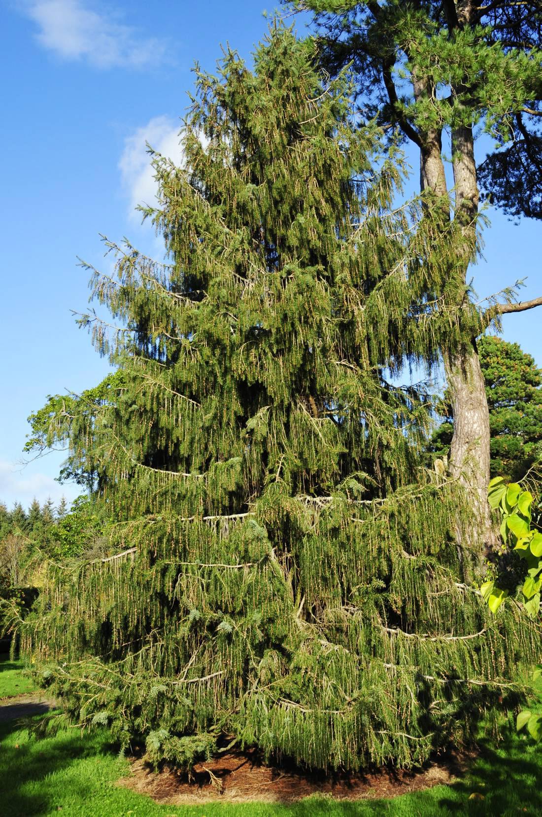 The Kashmir cypress, Cupressus cashmeriana, is a remarkably beautiful tree. Related to the Nootka cypress, it comes from Kashmir in India and it is not hardy, unlike its tough Nootka cousin. The Kashmir cypress has folds of fine, flat foliage that cascades from the branches on an upright, columnar tree. It broadens with age and is at its best in its early decades. However, it is only found in areas with mild weather.