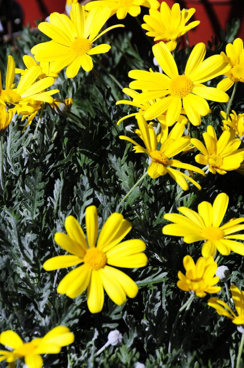 Euryops, the golden daisy bush from South Africa, is a fast-growing, soft, bushy plant with ferny leaves, that covers itself with bright yellow daisies. In mild gardens, there is rarely a time when there are no flowers on it.