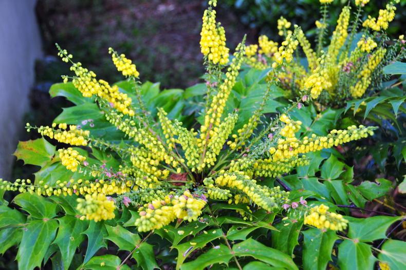 The flowers are carried conspicuously at the top of the plant in a tuft of slender spiky sprays, each floret resembling a tiny daffodil, and, remarkably, the flowers are scented of daffodils too. There is, of course, no connection with daffodils, the mahonia is a member of the berberis family. But it is reasonable to assume that two plants evolved to produce a similar scent if it was effective in attracting pollinating insects during the chilly months of the year. If the taller mahonias get too tall, as the plants often do after about 10 years, they can be cut back hard and will sprout again from the base to make a more bushy growth.