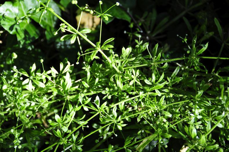 Cleavers is a common weed, also widely called Sticky Nelly because it sticks to clothes by means of tiny hooks on the edges of the leaves and stems. The system of tiny hooks acts in two significant ways. One is that the hooks help the stems of the plant to climb, scrambling up other plants, garden scrubs or flowers, and it spreads vigorously over piles of old pruning. It can climb to 2m, though usually less.
