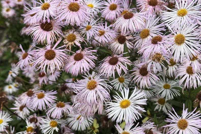 Erigeron ‘Schneewittchen’ which translates to ‘Snow White’ as in the fairy tale character, is a loose growing plant to 30cm high producing a continuous display of daisy flowers from early summer into late autumn. Plant it alongside Bergenia ‘Bressingham Salmon’ which is a good description of its flower colour for a magical picture.
