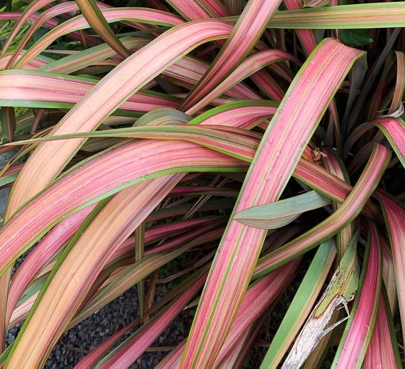The outstanding feature of the New Zealand flax is its remarkable foliage. Recognised to be very wind resistant, it also has the quality of lasting year-round, indeed, some leaves last for years, creating a dense clump capable of suppressing weeds in the vicinity. Not only is it wind resistant and evergreen, but the upright manner of growth – or an arching habit that some kinds adopt – looks very well when planted with trees and shrubs. Although the original plants were plain green, a remarkable range of leaf colours have been bred in recent decades, ranging from green, yellow, red, pink, purple and almost black.