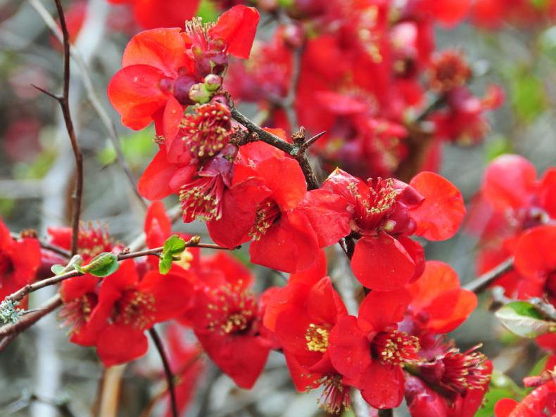 The Japanese quince is one of the prettiest spring shrubs. The first flowers are often produced as early as January on bare stems and a few well into May. It often produces hard, deeply lined fruit that is edible but only when cooked for jams and jellies, similar to the true quince, Cydonia. The best known variety, ‘Crimson and Gold’ has bright red flowers and golden anthers at the centre of the flower. It is very striking and the flowers are carried in large numbers along the branches. The variety ‘Apple Blossom’ has large white flowers flushed with pink.