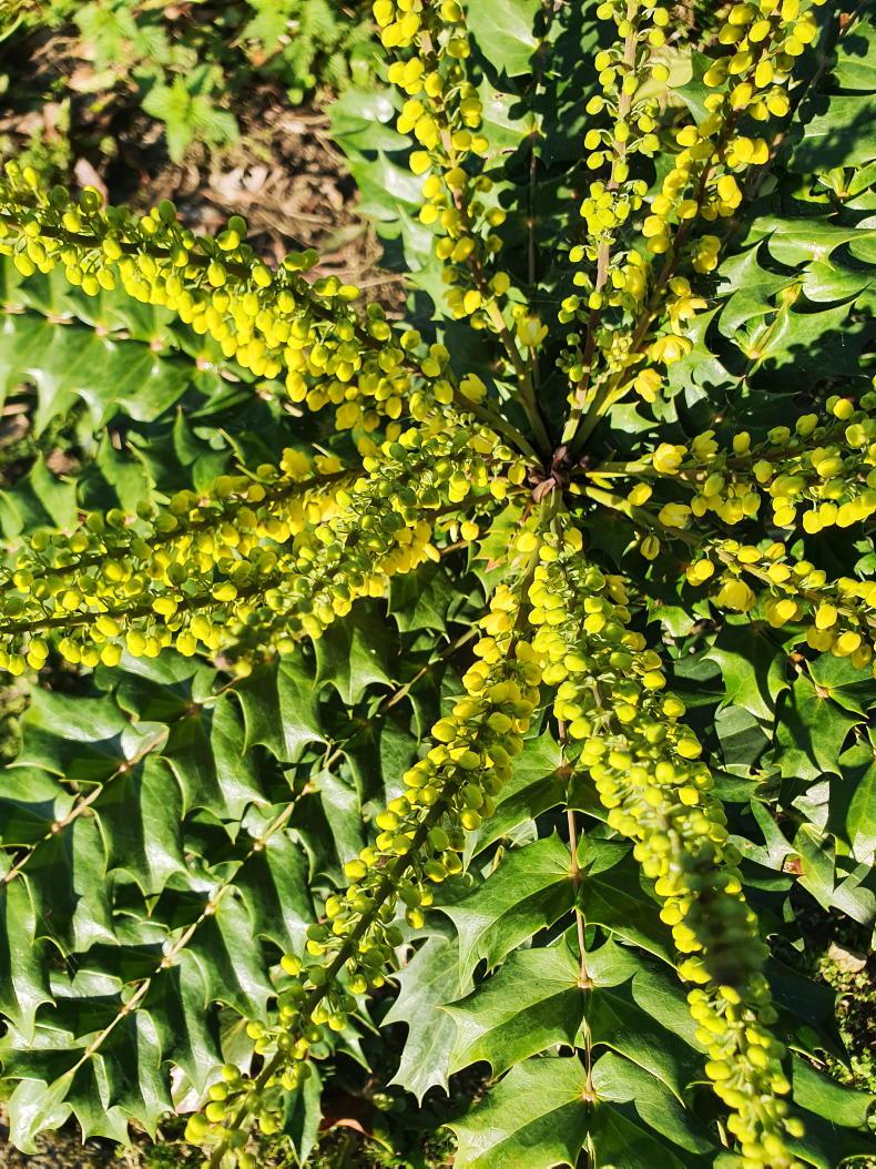 The leaves of all mahonias are made up of leaflets and the smaller kinds have fewer leaflets on each leaf, just nine in some cases. It can look like the leaflets are single leaves attached to small leaf stalks. The American species flower in early to mid-spring while the Chinese kinds from late autumn to late winter.