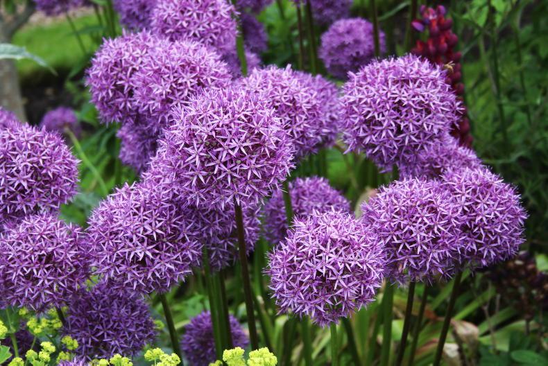 Plant allium bulbs among your roses in mid to late autumn, at the same time as spring-flowering daffodils and tulips.