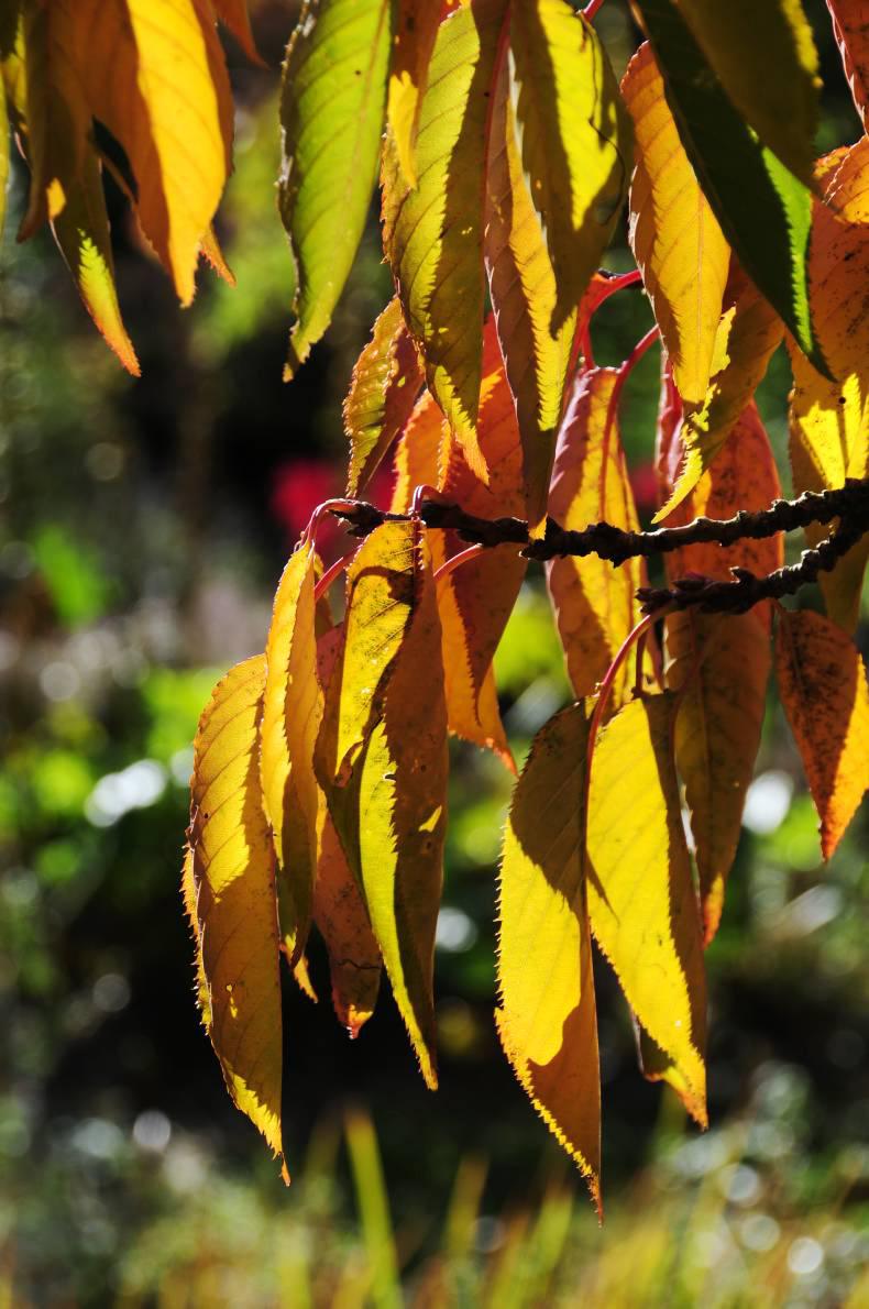 But flowering cherries have a second season of interest in autumn, one that can be as dramatic and as beautiful in its own way. They are renowned for their brilliant autumn colour in shades of yellow, orange, red and purple, often displayed when some of the leaves are still green, making a lovely combination. This aspect of the flowering cherries is only given secondary consideration, if it is taken into account at all, but it is, at very least, a great bonus.