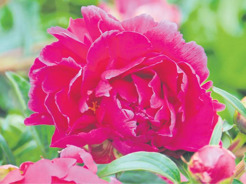 Peonies have long been popular in country gardens, especially those with large rounded, dark-red, double flowers over deep-green, lush foliage. Old-fashioned pink and white-flowered plants are often seen too. Typically, the plant forms a great mound of foliage with sumptuous flowers dotted over it. The flower petals are wonderfully silky, with a sheen and a fresh newness about the flowers that speaks of early summer. Many people still call them “peony roses” because they resemble fully double roses, although they are not related, and have no connection with roses.