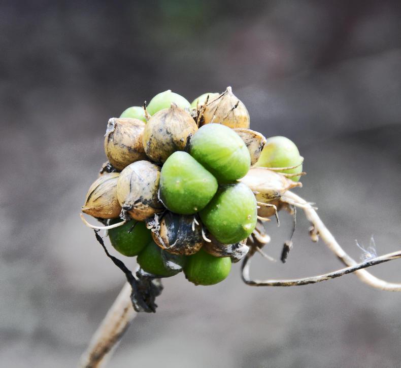 The plant produces a tall flower stem, sometimes 2m, just as leeks do, and much taller and more sturdy than true garlic. Some small florets can be produced but usually the “flower head” consists of small round bulbils. Like the root bulbils, these can be planted in a row to eventually grow to full size. If left to fall, around now, they come up anyway, but maybe in the wrong places.