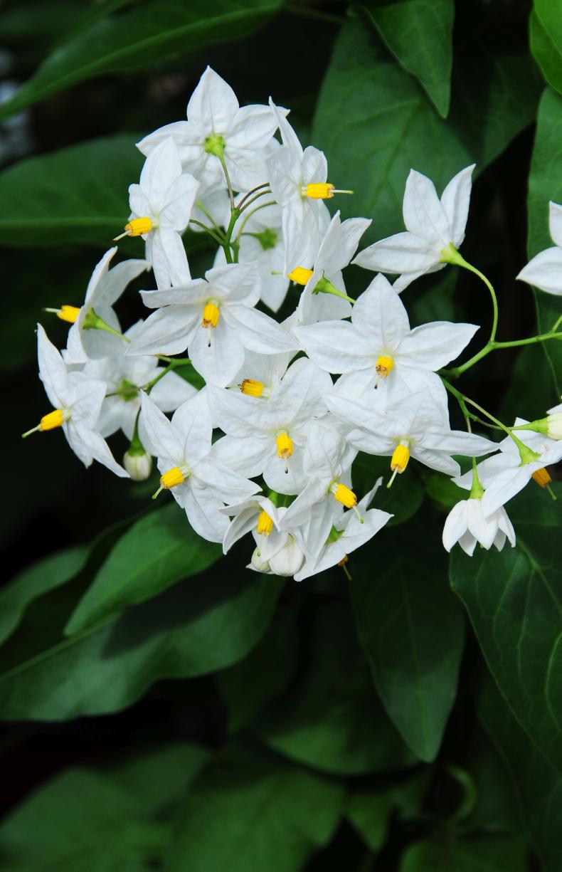 A close look at the individual flowers shows how similar they are to potato flowers, including the central tube-like group of yellow, pollen-bearing anthers, a feature which true jasmine does not have.