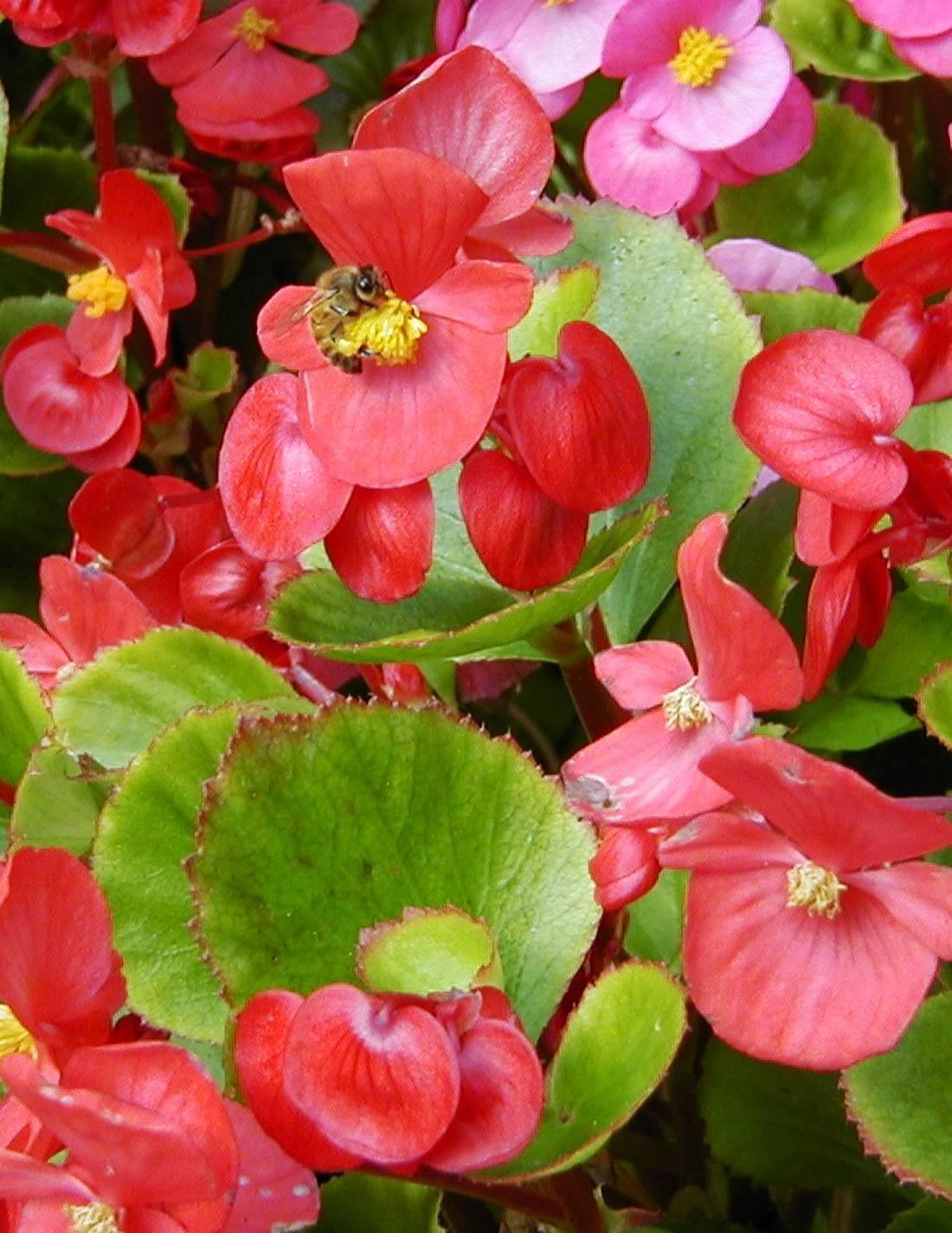 Busy lizzies and begonias are good in the shade, dahlias and geraniums are not. Some kinds are versatile. Busy lizzies, bedding begonias and geraniums can be used in a variety of settings.