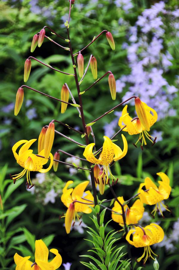 The turkscap lily, or martagon lily, is relatively easy to grow with masses of small reflexed, purple flowers, turban-like. It is a mountain meadow plant and does well in our cool, moist climate and in partial shade. Lilies like well-drained soil, enriched with humus, free-draining and not wet in winter.