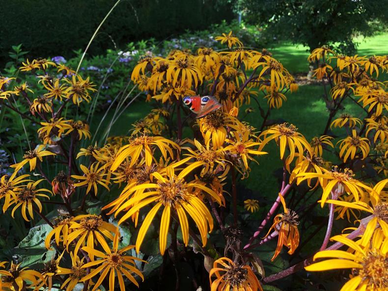 Attract butterflies. A good plant for attracting butterflies at this time of year is ligularia dentata. It’s also a good addition to a flower bed but beware the snails love it too.