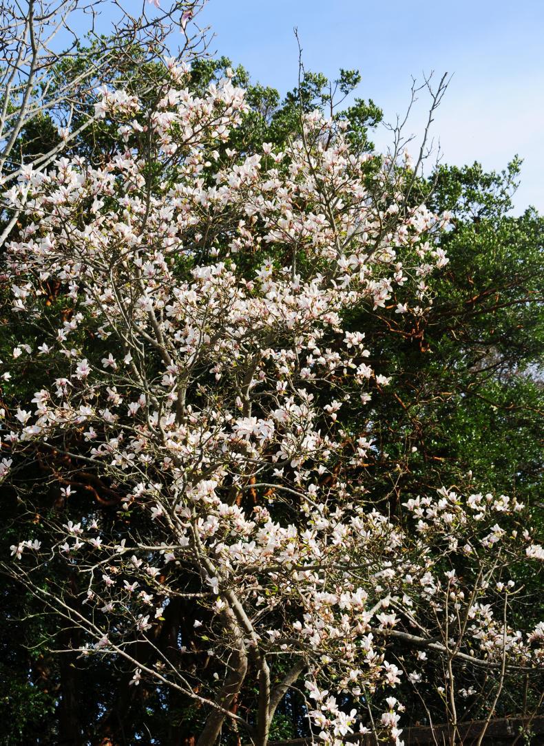 Magnolia kobus is a big tree magnolia, growing to 12 metres and 10 metres wide, covered plentifully with smallish white flowers with a flash of purple at the base.
