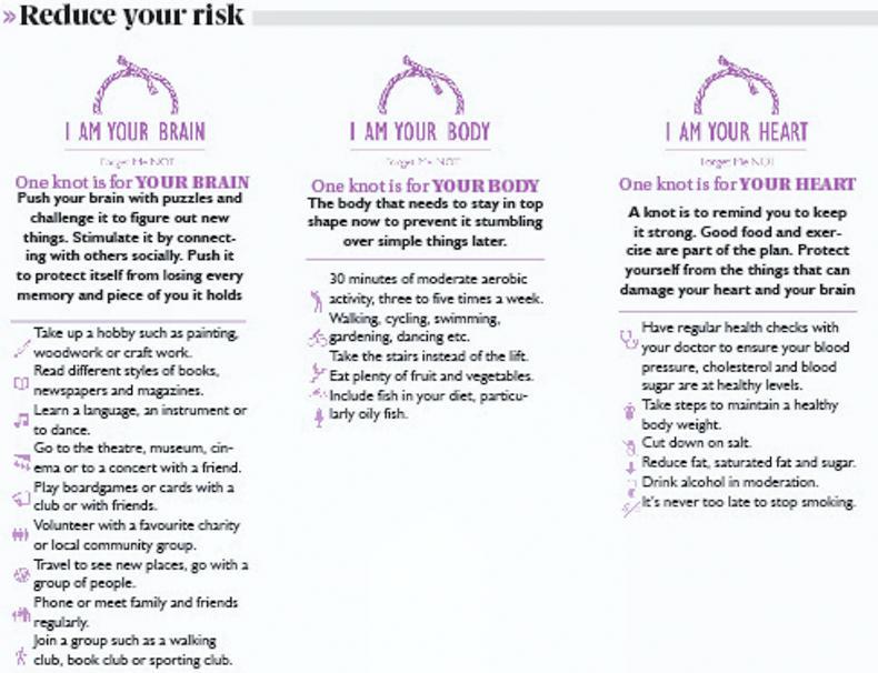 “We all know the health messages about not smoking and not drinking too much and keeping our hearts healthy, but I don’t think we always associate that with our brain health as well. We need to keep our hearts, bodies and brains healthy in order to reduce the risk of developing any of the different types of dementia.”