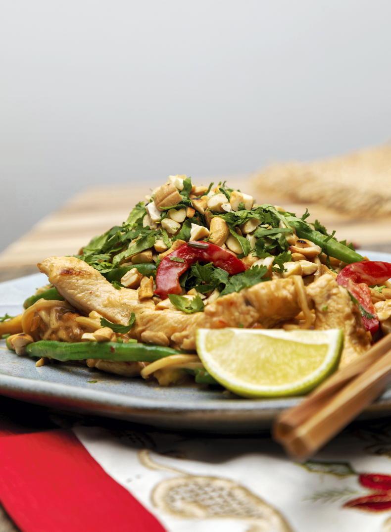 3 Drain the noodles and add to the wok with the coconut milk, turkey, peanut butter, soy sauce, chilli sauce, sugar and lime juice. Stir-fry for another 2–3 minutes, until all the ingredients are piping hot.