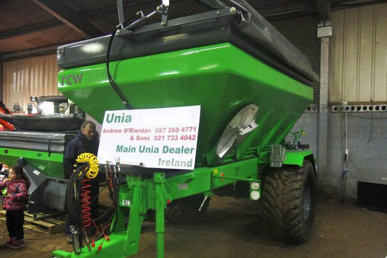 New to Millstreet and Ireland is the UNIA range of fertiliser spreaders. The machines are being imported by Andrew O’Riordan from Coachford, Co Cork, who displayed the RCW 8200 spreader. This trailed bulk spreader has an eight-tonne capacity, a spreading width of 12m to 36m, and it comes with a land drive for the belt and a PTO drive.