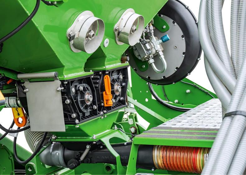 The seed and/or fertiliser is fed to the coulters via the segmented distributor head, using the single-shoot process. Two different seed types can also be sown in a single pass. For example, different seed rates can be metered and applied with the appropriate metering cassettes.