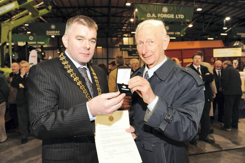 Then FTMTA president Eamonn Tinney presents the late Bernard Rice with the FTMTA Gold Award for his services to the farm machinery industry at the FTMTA Farm Machinery Show 2009.