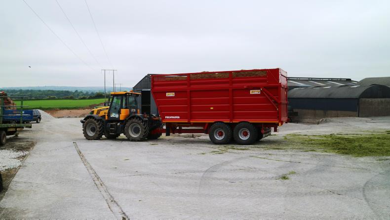 Once through the harvester, the grass is deposited into some newly purchased Smyth Supercube trailers. The pride of the fleet is a 22ft version which on the day I was there was attached to a JCB Fastrac. Padraig Noonan said that the Supercube works well and gives more capacity and slightly more weight on the draw bar than a standard trailer.