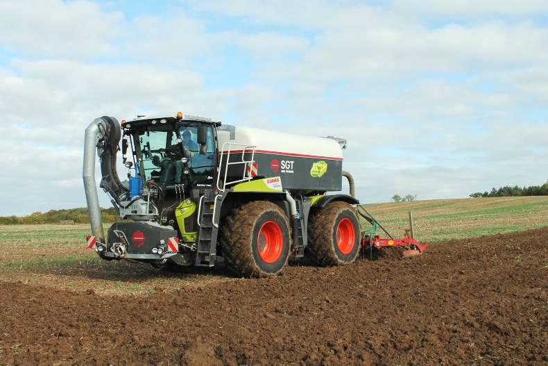 On the second Claas Saddle Trac 4000 was an SGT slurry tank system injecting liquid slurry in combination with a Sumo Trio cultivator. SGT is a German company specialising in trailed and mounted slurry equipment. It is now part of the Austrian Bauer group.