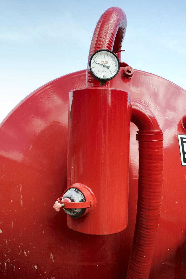 If the slurry gets past the primary shut-off valve located at the top of the tanker, then the secondary shut-off located in a cylindrical unit at the front of the tank comes into play. An inspection glass allows the operator to see if slurry has travelled too far and shut off the pump. If these become cloudy from age/sunlight damage, they are not very expensive to replace.