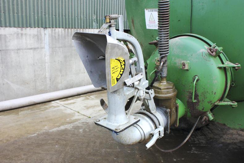 A close-up of the Moscha spreader unit, which is made from stainless steel and supported on a galvanised structure that fits to all makes of slurry tanker.