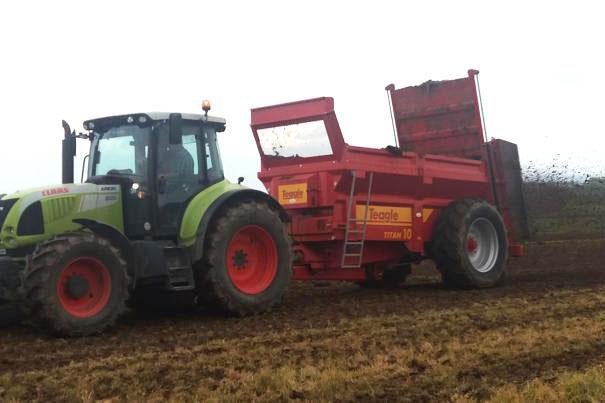 The Teagle Titan 10 Manufactured in the Cornwall, England, has 10m3 capacity. The 7.8m long machine weights 5,210kg empty and minimum power requirement is 105hp. Heaped capacity when greedy boards are fitted is 12.4m3. A hydraulically raised slurry door prevents material falling through the machine's vertical beaters when on the road. Full-width floor chains draw material to the vertical beaters, whose tips overlap for complete material shredding and spreading. The driveline underneath the machine is shielded and all lubrication points are at ground level.