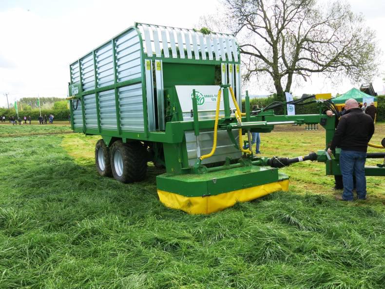 Future Grass Technology in Carlow displayed its zero grazer. The machine uses an Italian-built 2.1m Galfrey twin-drum mower to cut grass and feed it into a transport elevator, which pushes the crop upwards into the body of the machine.