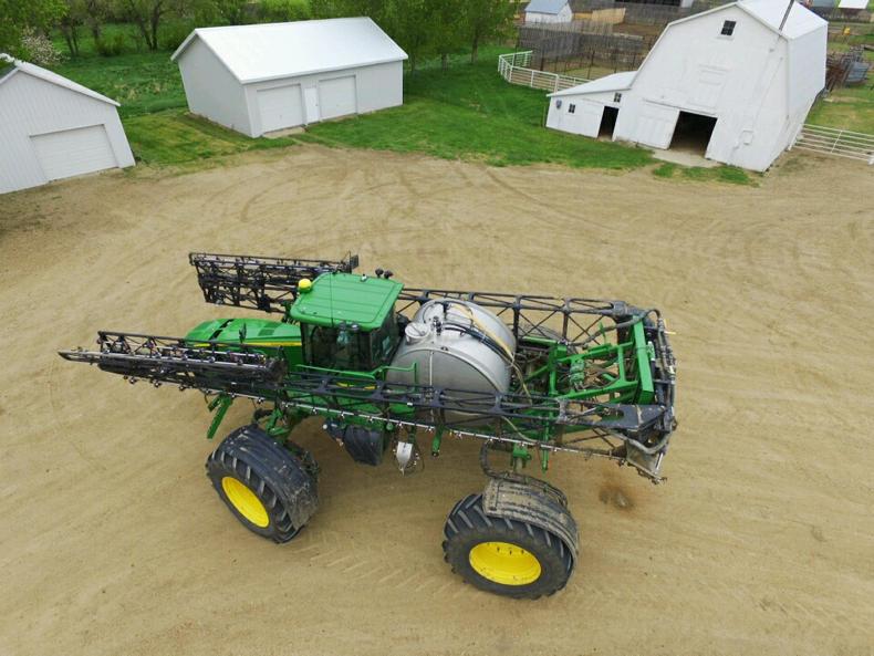 Dustin runs a John Deere 4940 self-propelled sprayer, the largest sprayer Deere offers. This machine has a stainless steel tank with a storage capacity of 4,542 litres (1,200 gallons).