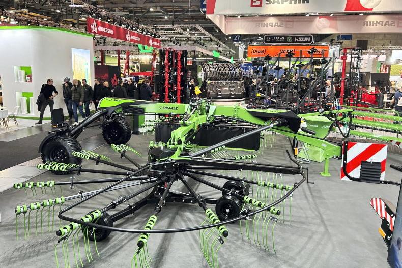 One of the many novelties from Samasz at Agritechnica, aside from the Polish manufacturer’s new 40th anniversary black colour scheme, was the new launch of its Z2-960 centre delivery, twin-rotor rake.